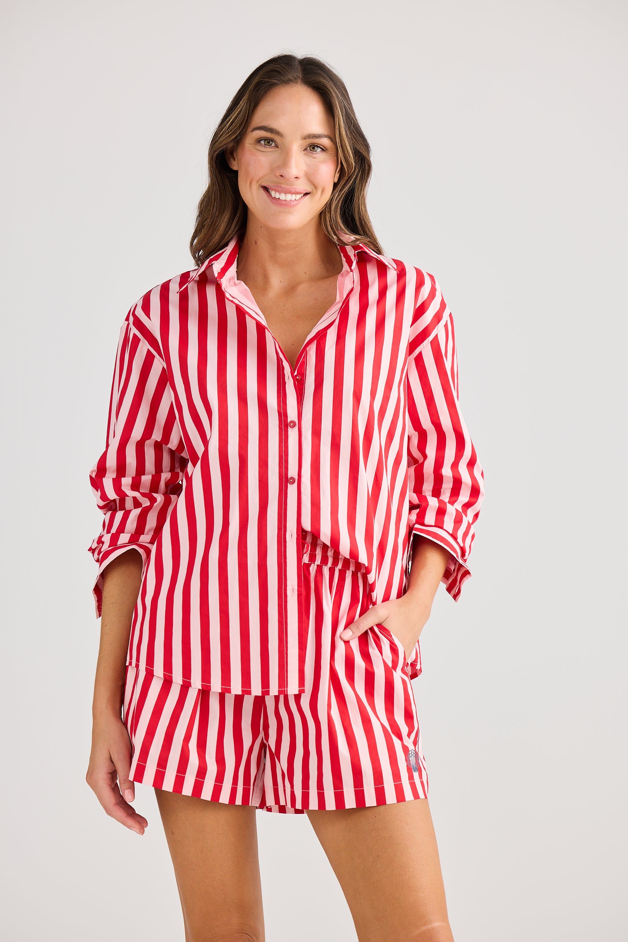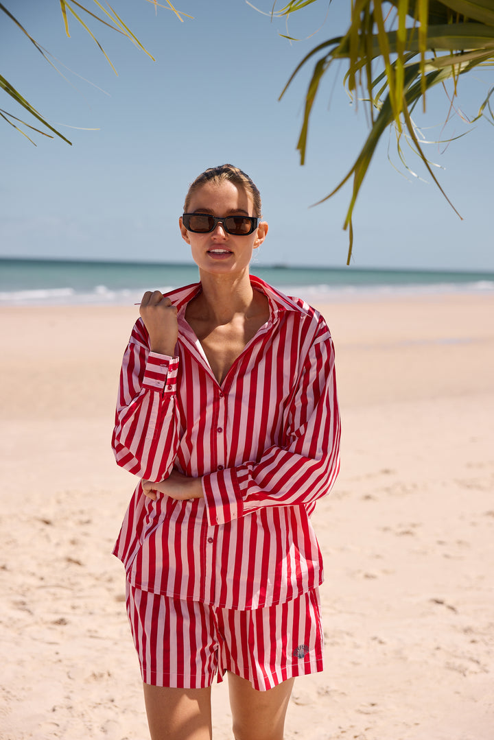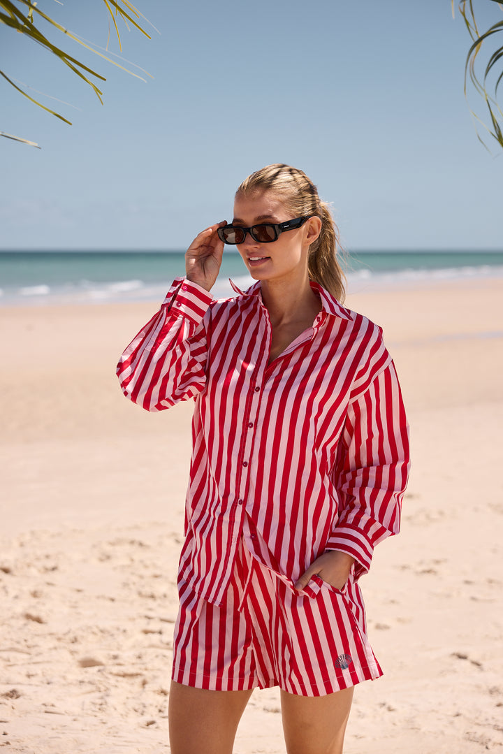 The Adrift Shirt by Holiday Trading features a classic collar and front button closure for timeless style. Its long sleeves with cuffs add a polished touch, while contrast embroidery on the back yoke creates a distinctive look. Crafted from printed stripe cotton, this shirt offers a relaxed fit that combines comfort with effortless sophistication. Matches back with the Adrift Shorts for a gorgeous fresh looking Summer Set.