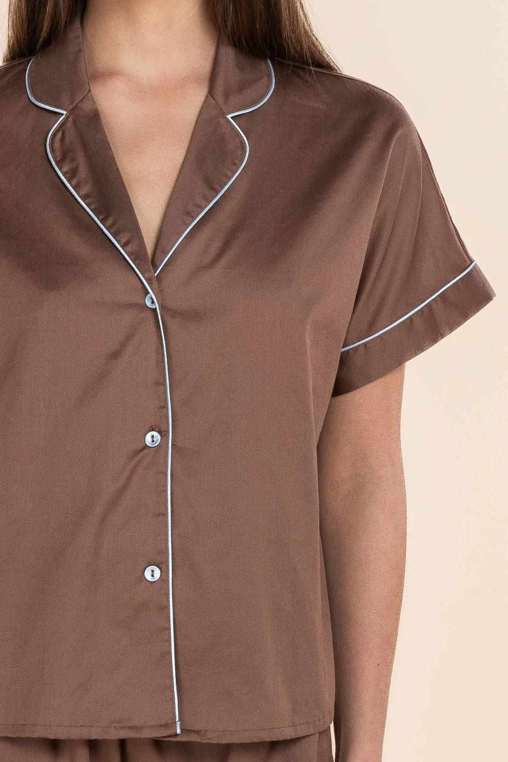 The Ariana Short Set in chocolate brown with turquoise piping is proof that some styles never go out of style. A Gingerlilly best seller season after season, this set combines luxe cotton sateen with a relaxed cut for year-round comfort. The short-sleeve, button-through top is finished with crisp contrast piping, while the matching shorts include an adjustable waist tie, side pockets, and a subtle Gingerlilly monogram.