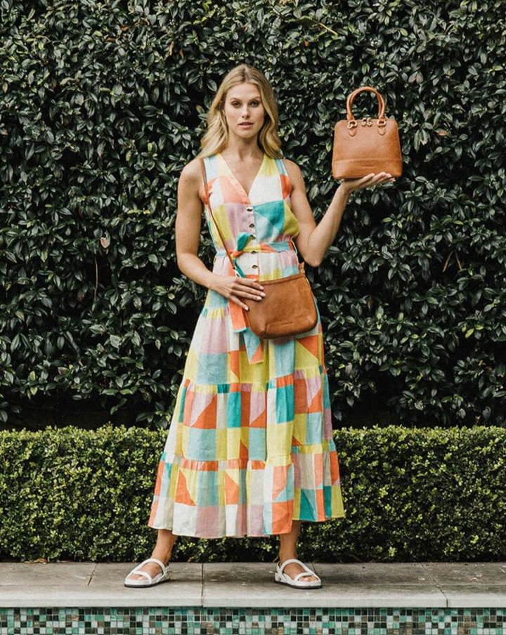 The Elms+King Fairfax Top Grip is made from premium polyurethane. The handbag offers style and flexibility, featuring classic top grip handles, and 2 removable crossbody strap options. The double head, deep gusset zipper opens to reveal our signature blue & white gingham lining, a zipper pocket with PU trim and an open top slip pocket.