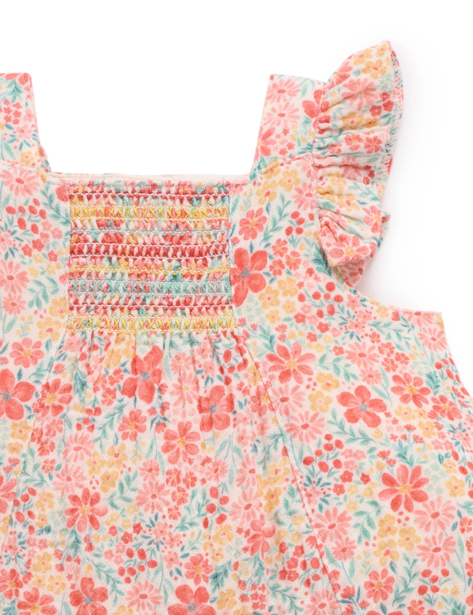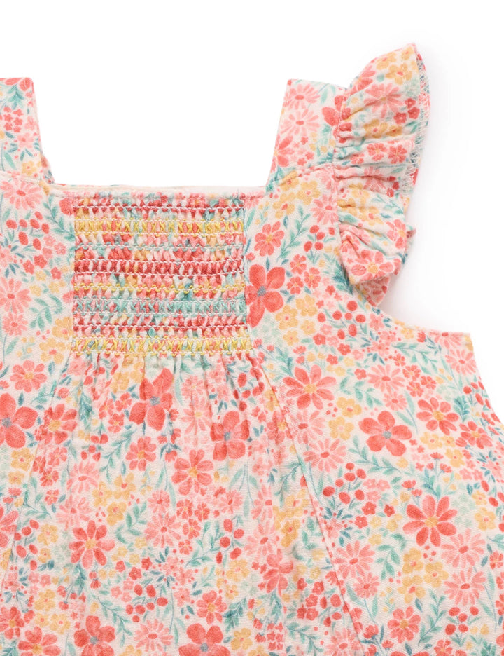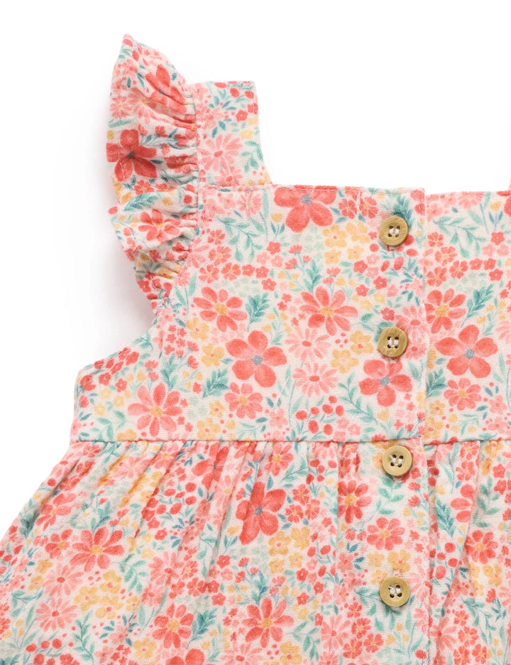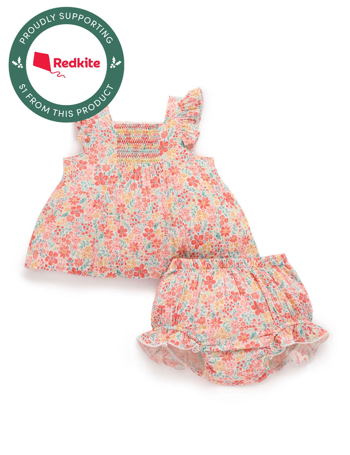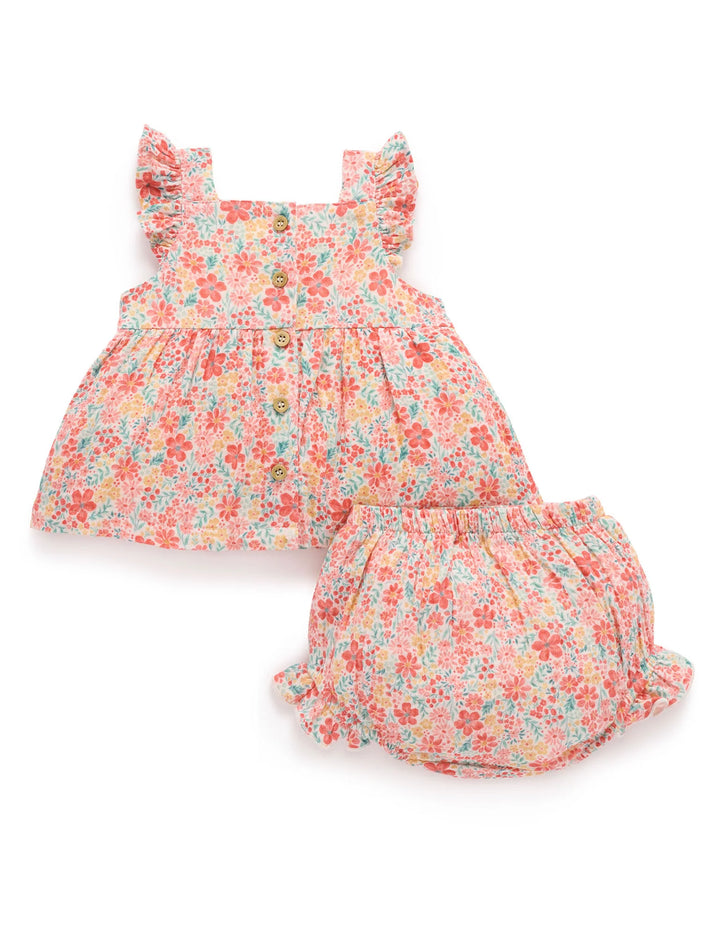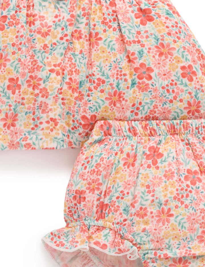 This Pure Baby Festive Floral Set is perfect for those warmer summer days! Featuring a matching top and bloomer set with ruffle trimmings in the sweetest summer floral print. Made from 100% Organic Cotton muslin for a lightweight and breathable easy wear outfit. Style with our matching Festive Bow Headband for a sweet outfit.