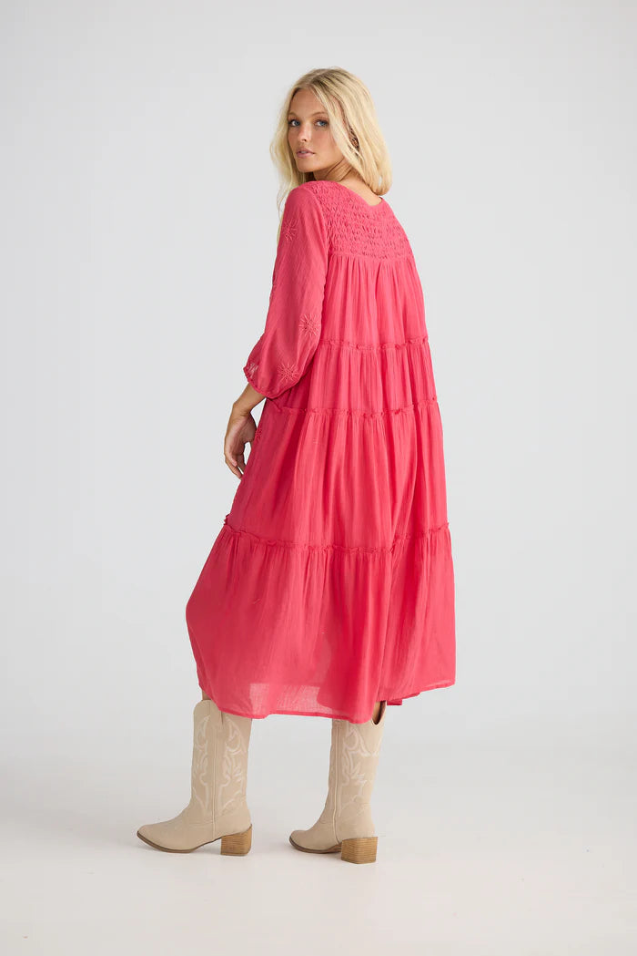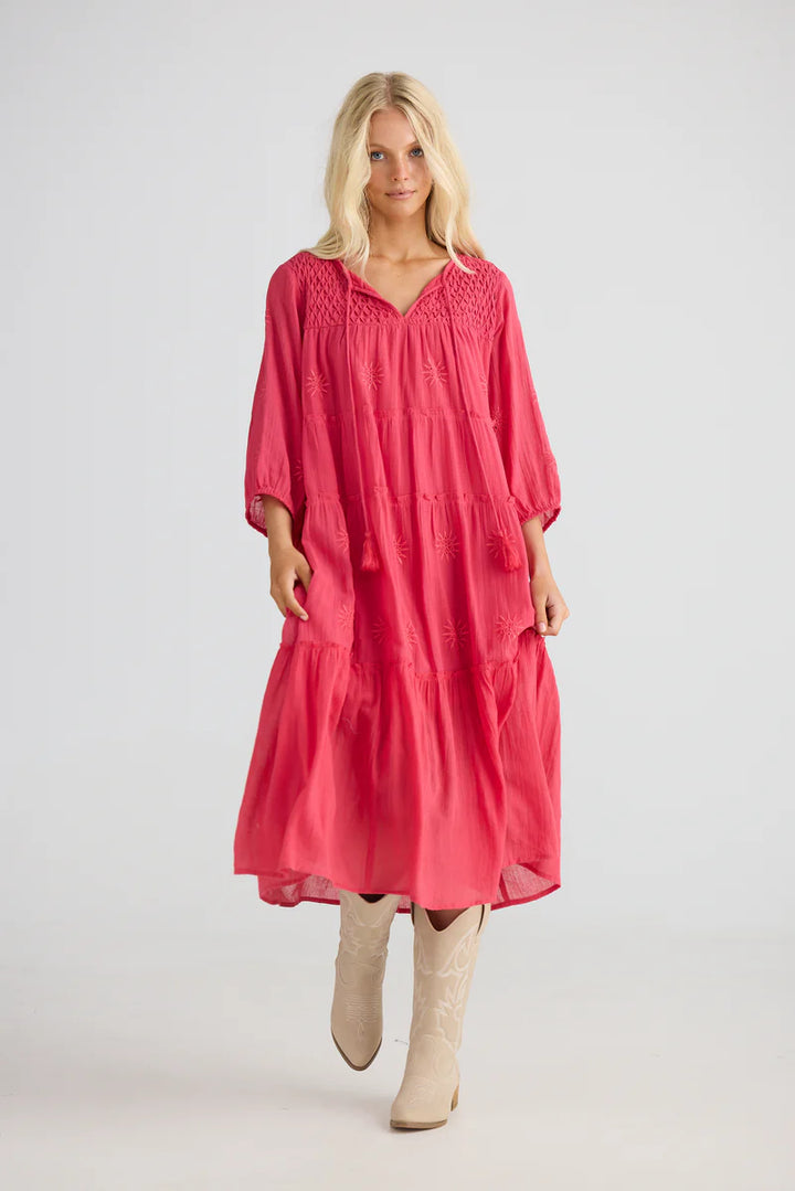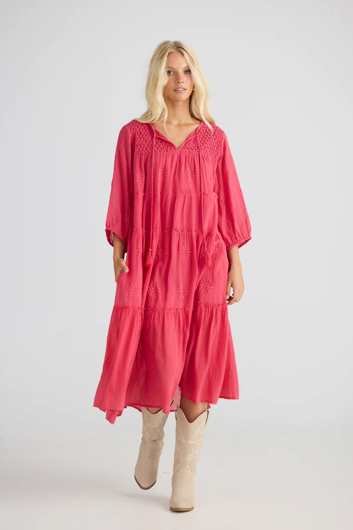 Elevate your wardrobe with the Francie Dress, a sophisticated piece that combines timeless elegance with modern charm. The distinctive round neckline features a keyhole cutout and detail ties, while expertly crafted smocking on the front and back yoke creates beautiful texture and dimension. Mid-length sleeves offer the perfect balance of coverage and style, complemented by delicate frills along the tiered seams. Intricate floral embroidery adds a refined finishing touch, and the fully lined construction ensures you'll feel confident and comfortable from morning to night.