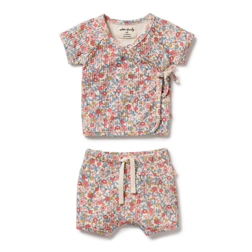 This Periwinkle kimono set is a must-have for newborns. Made from soft, breathable GOTS-certified organic drop needle cotton, it features a pretty all-over Periwinkle print and is gentle on delicate skin. The wrap-style kimono top ties easily at the side for fuss-free dressing, while the soft, elasticated shorts keep your little one comfy all day long. A practical and adorable set for everyday wear. Key Features: Kimono-style top with side tie for easy dressing. Soft elasticated waistband on shorts for a comfy fit. Lightweight and breathable fabric. Gentle on sensitive newborn skin. Made from GOTS-certified organic cotton. Sustainably produced. Packaged in a bio-degradable bag. Details: 95% GOTS-certified organic cotton, 5 % elastane. Certified by: Ecocert, EGL 212333. Machine washable. Made in India.