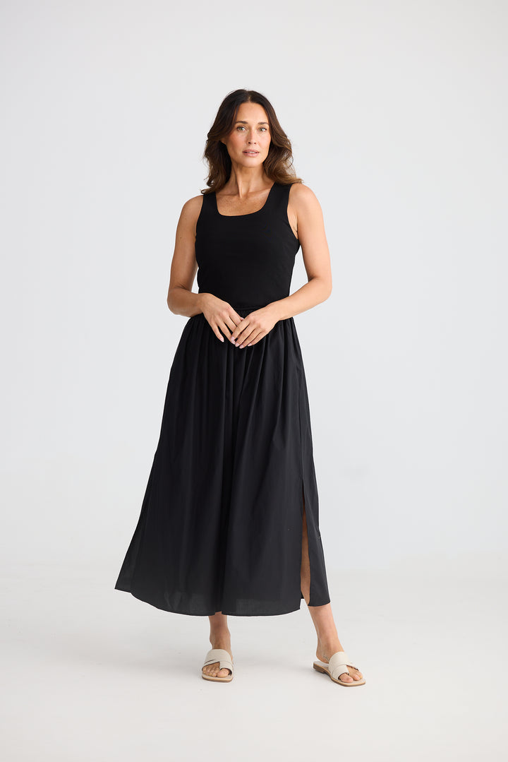 This sleek black midi features a fitted square-neck bodice that means business, paired with a flowy A-line skirt that actually lets you move. The clever blend of cotton, lyocell, and jersey keeps things comfy all day long, while hidden pockets and cheeky side splits add that modern edge.