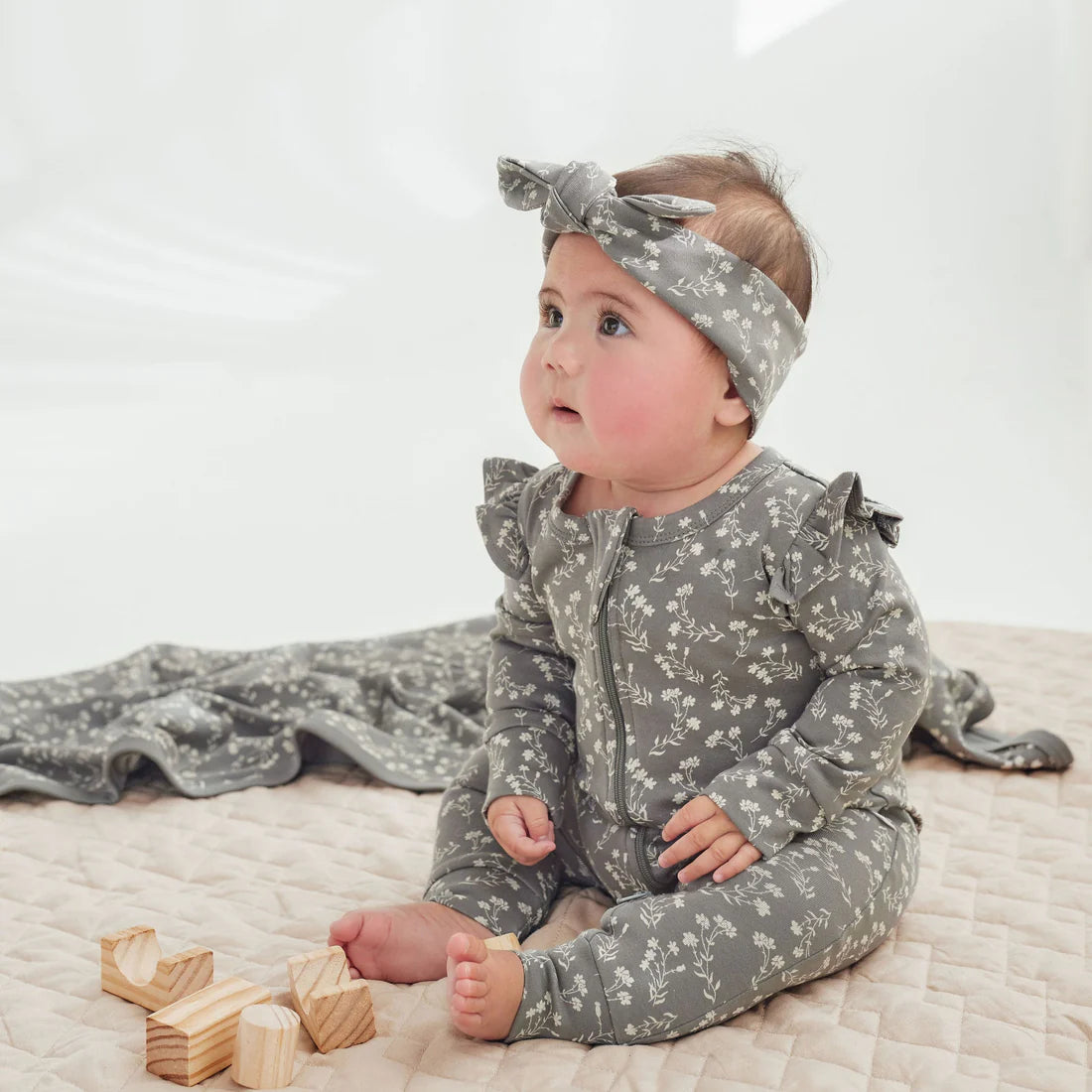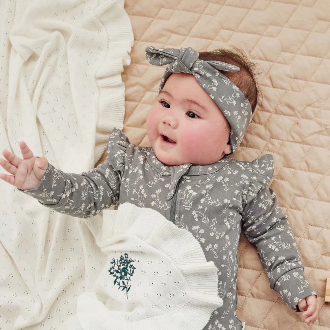 Adorned in a delicate hand illustrated florals and fun frills this zip romper is sure to be a winter favourite.