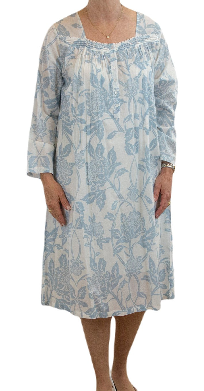 Long Sleeve Sq Neck Cotton Nightie - Blue Waratah Print