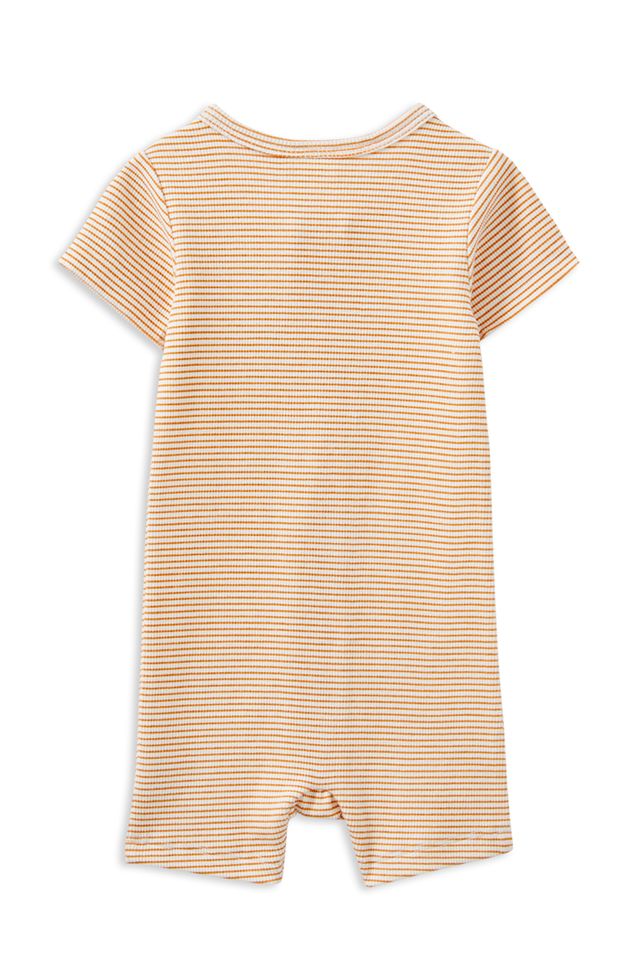 Milky Clothing Caramel Rib Zip Romper. Introducing our adorable Caramel Rib Zip Romper, the perfect blend of comfort, style, and functionality for your little one. Crafted with utmost care and attention to detail, this romper is designed to keep your baby snug and stylish all day long. Featuring a horizontal stripe in caramal and white, this romper adds a touch of charm to your baby's wardrobe. The playful design is complemented by a convenient center front 2-way zip, making dressing and nappy changes a breeze.