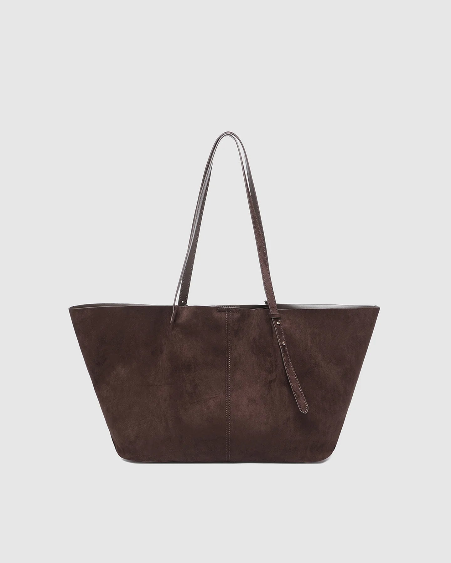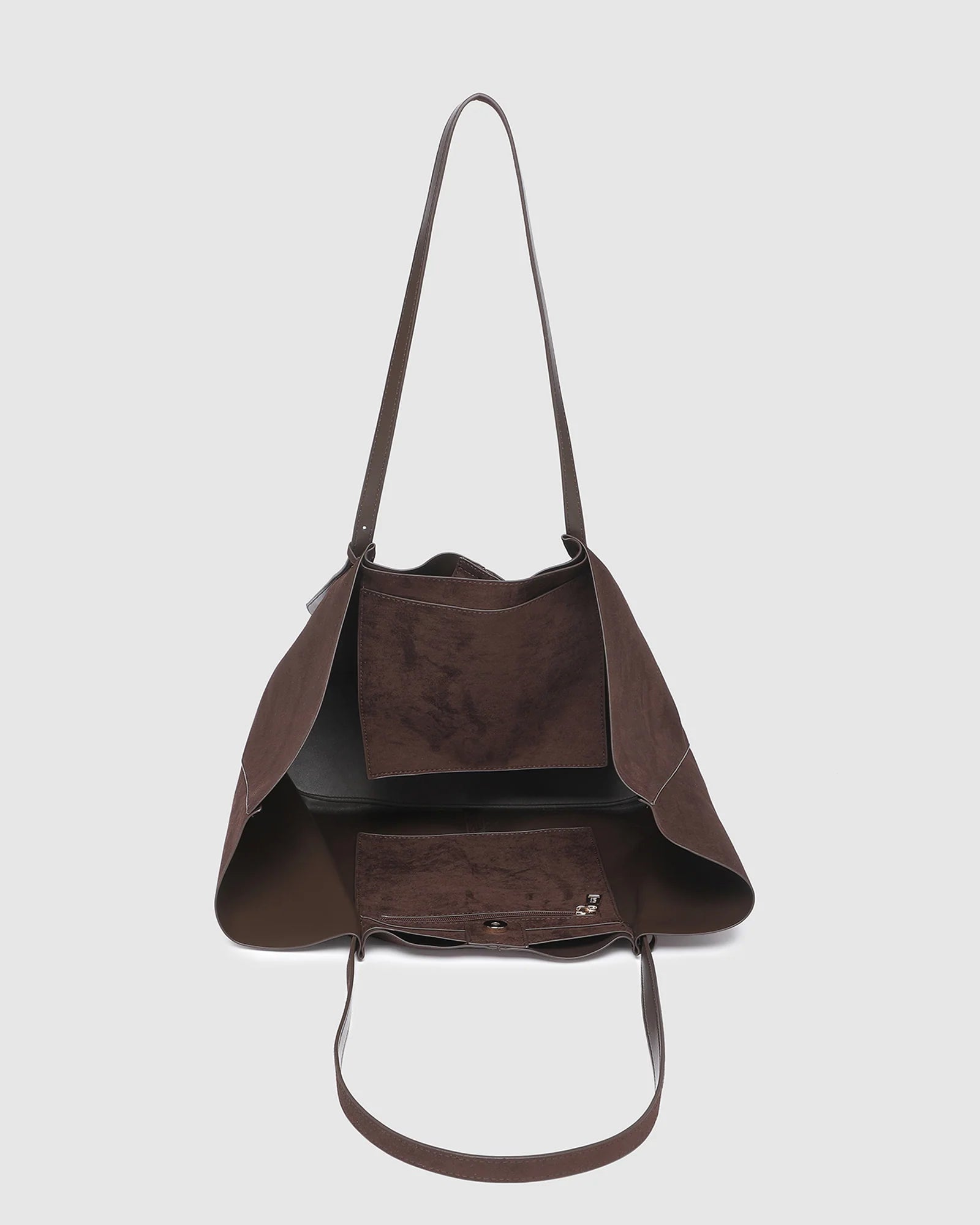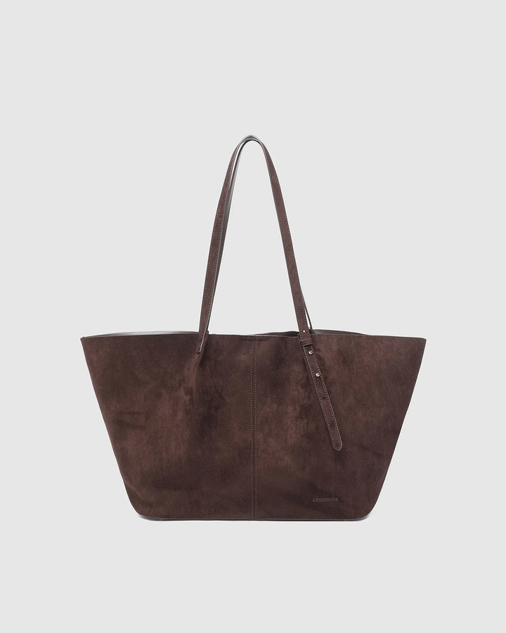 Designed for slow days and little getaways, the Sawyer Chocolate Suedette Tote Bag brings relaxed sophistication to every escape, shaped in a soft trapeze silhouette that blends structure with ease. Crafted in a rich chocolate hue, this faux suede tote bag adds depth and texture to any outfit, pairing effortlessly with cosy knits, crisp shirting, or weekend denim. Spacious enough to fit a 16-inch laptop when needed, she remains an office bag without laptop compartment, offering flexible, uncomplicated carry for both workdays and weekends. A magnetic clasp opens to internal pockets for tidy organisation, while light gold feet keep her base pristine on the move. Finished with adjustable shoulder straps and understated gold detailing, Sawyer Chocolate Suedette is the versatile plus-one you’ll reach for in every unhurried moment.