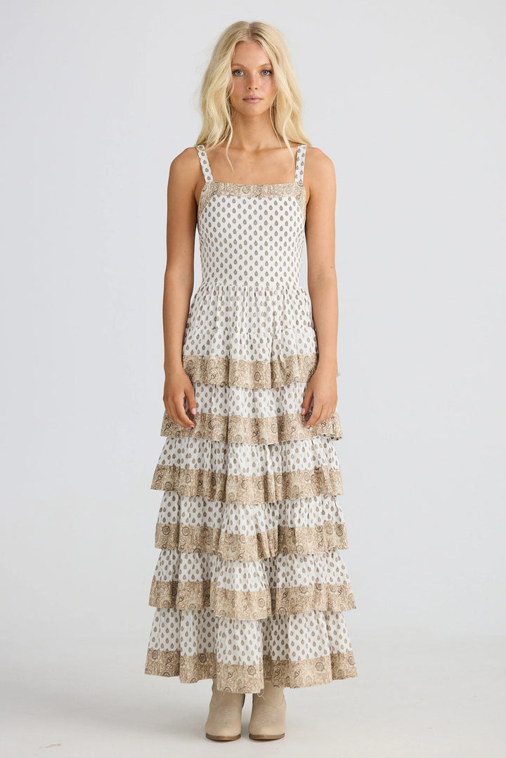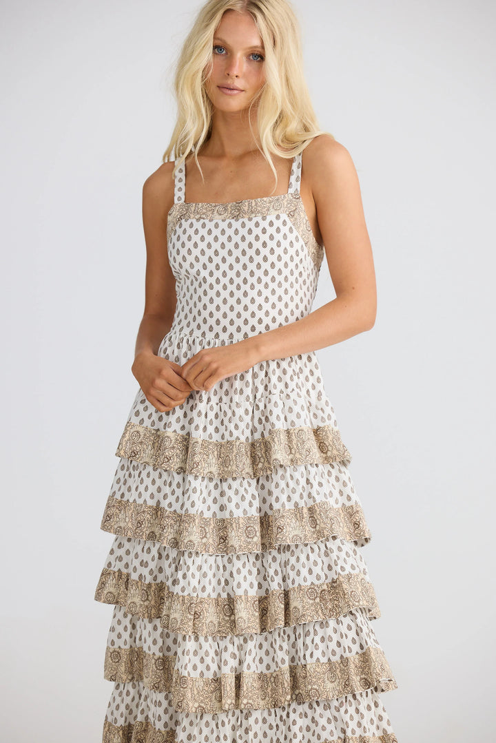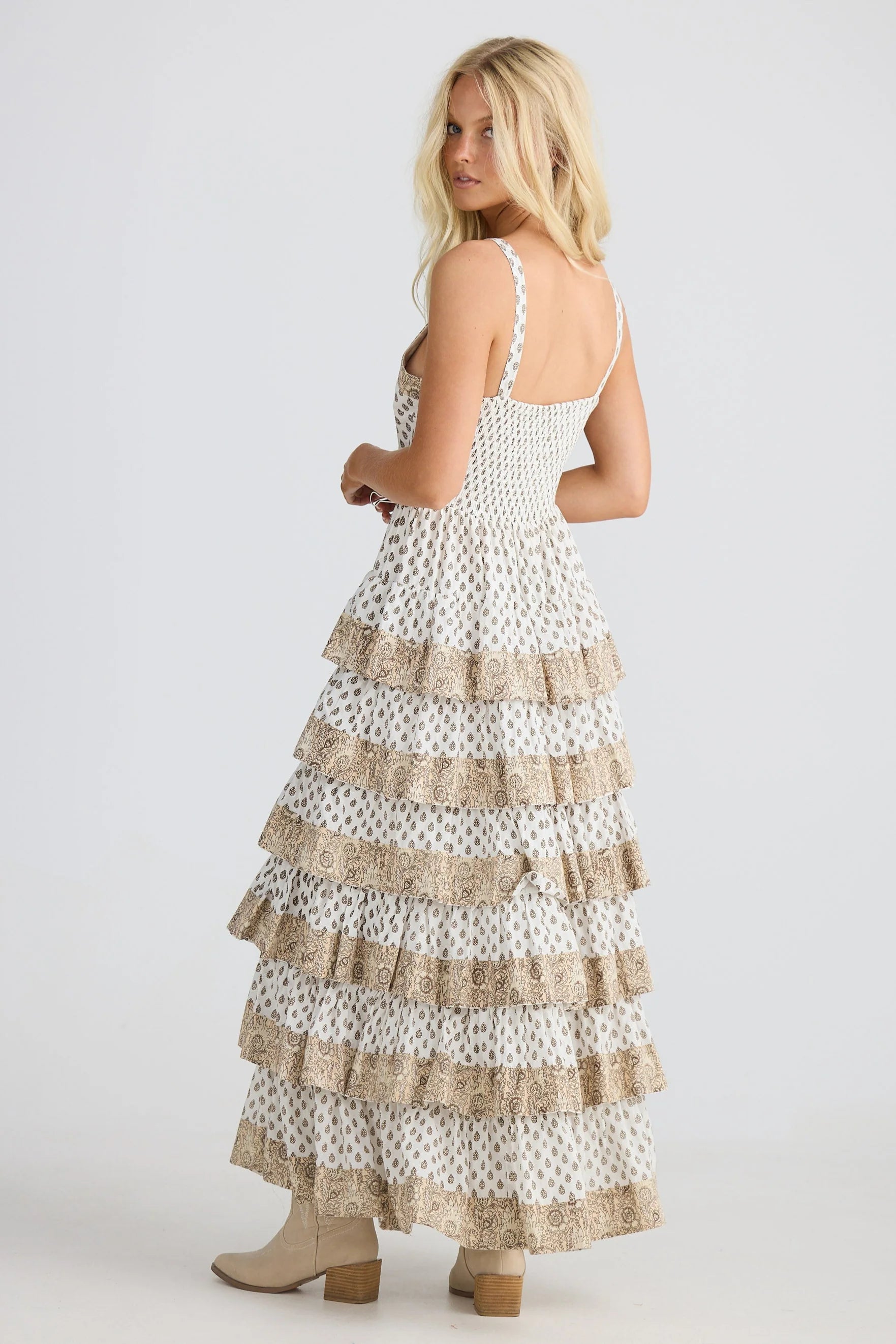 Turn every entrance into a moment with the Silvana Maxi Dress. This showstopper features a charming square neckline with delicate ruffles and supportive straps that frame your shoulders beautifully. The fitted bodice is sculpted with subtle back shirring for a flattering silhouette, while soft gathering at the waist creates effortless movement. A tiered maxi skirt flows gracefully downward, finished with a striking contrast border hem. Fully lined for comfort and confidence.