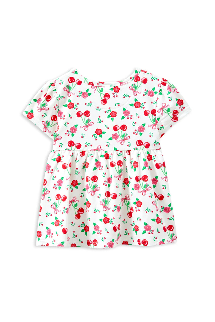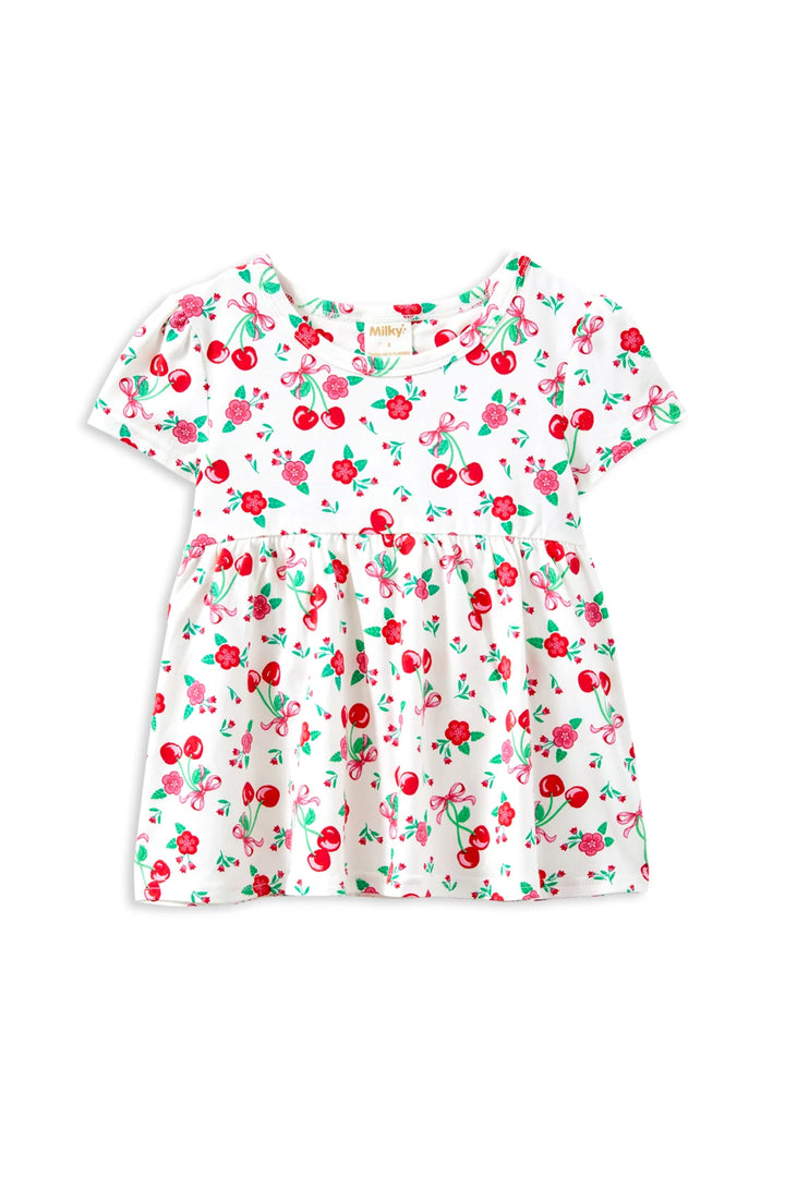 Milky Clothing Sweet Cherry Swing Tee is a playful and breezy addition to your little one's wardrobe. Made from a soft cotton-rich blend, this charming tee features a crisp white base adorned with a beautiful floral print. With short sleeves and a gathered waistline, it provides a flattering, airy fit that's perfect for twirling and play. Pair it with the matching Sweet Cherry Bike Shorts for a coordinated, trendy look, or mix and match with your favorite Milky shorts or leggings for a casual, effortless style. This versatile tee ensures your little one stays stylish and comfortable all day long.