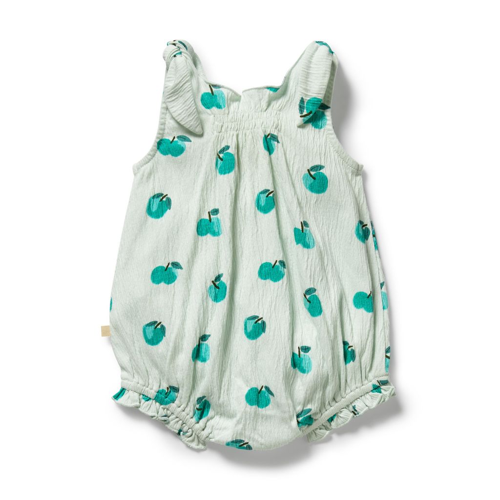 Bright, breezy, and made for everyday adventures – our apple papple baby playsuit is as sweet as it is practical. Crafted from soft, breathable fabric, this one-piece features a loose, comfortable fit to keep baby cool and comfy all day long. Designed with mock tie straps, soft shirring across the chest, and delicate ruffles at the leg openings, it’s full of playful charm. Finished in our fun apple papple print, it’s perfect for warm days, park play, or simply relaxing at home. Key Features: Snaps at crotch for easy nappy changes. Loose-fitting. Mock shoulder straps. Made from organic cotton. Packaged in a bio-degradable bag. Details: 96% organic cotton, 3% polyester 1% elastane. Machine washable. Made in India.