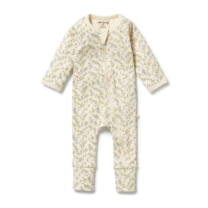 Keep your newborn comfy and cosy in this practical yet adorable footed zipsuit from Wilson and Frenchy. Made from GOTS-certified organic drop needle cotton, it’s soft, breathable, and gentle on delicate skin. Featuring a pretty lemon leaf print all over, this zipsuit is designed with fold-over mittens (in sizes newborn to 000) to help prevent scratches, and a two-way zip for quick and easy nappy changes. With the option of a footed design, it’s perfect for keeping little ones snug as they grow. Key Features: Round neckline with concealed zipper for safety. Long sleeved with fold over mittens (newborn to 000). Option for footed or footless wear. Two-way zip closure for easy changes. Made from GOTS-certified organic cotton. Sustainably produced. Packaged in a bio-degradable bag. Details: 95% GOTS-certified organic cotton, 5 % elastane. Certified by: Ecocert, EGL 212333. Low fire danger - Complies to the AS, NZS 1249-2014 sleepwear standards. CAUTION - KEEP AWAY FROM HEAT AND FLAME. Machine washable. Made in India.
